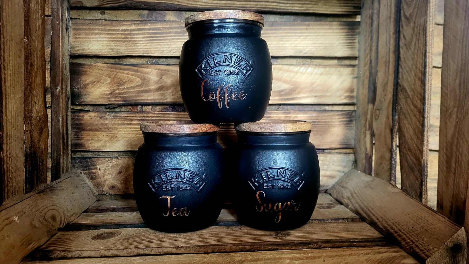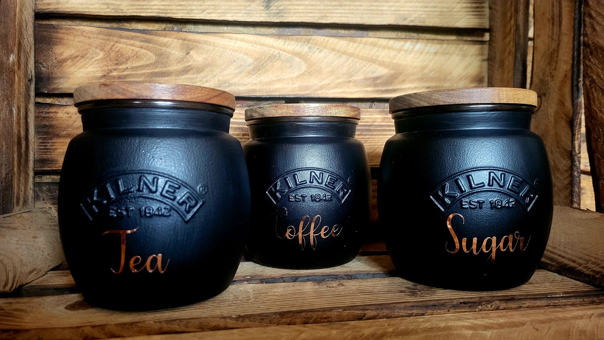 Tea, coffee and sugar, biscuit and utensil kilner jars with push fit acacia wood lids. Painted and finished with wording of your choice.